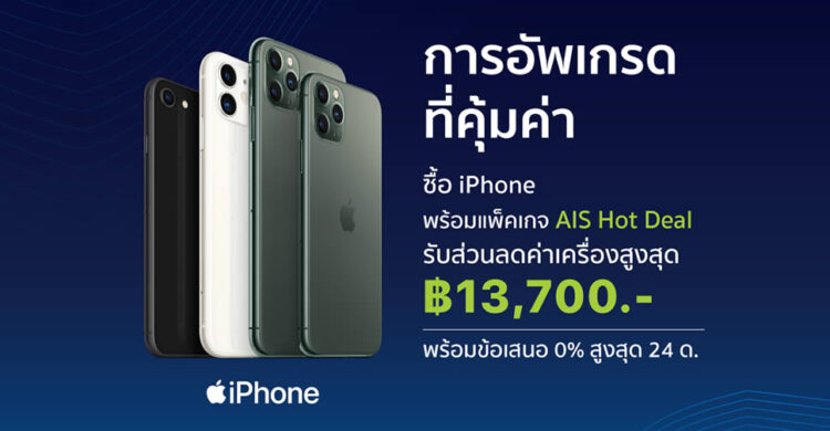 พบกับ iPhone SE 2, iPhone 11, iPhone 11 Pro และ iPhone 11 Pro Max ในราคาสุดพิเศษจาก iStudio by SPVi ลดสูงสุด 13,700 บาท เมื่อซื้อพร้อมสมัครแพ็คเกจรายเดือนจาก AIS ในโปรโมชั่น AIS Hot Deal และสามารถใช้สิทธิ์ผ่อน 0% นานสูงสุด 24 เดือน กับธนาคารที่ร่วมรายการ