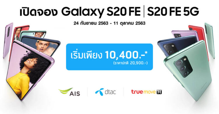 Samsung เปิดรับจองสมาร์ทโฟนเรือธงรุ่นล่าสุด Galaxy S20 FE อย่างทางการในไทยแล้ววันนี้!! โดยมีให้เลือก 2 รุ่น ได้แก่ 4G ราคา 20,900 บาท และ 5G ราคา 23,900 บาท แต่ถ้าสั่งจองผ่านผู้ให้บริการรายฯ จะสามารถเป็นเจ้าของได้ในราคาเริ่มต้นเพียง 10,400 บาท โดยแต่ละค่ายมีข้อเสนอแตกต่างกันดังนี้