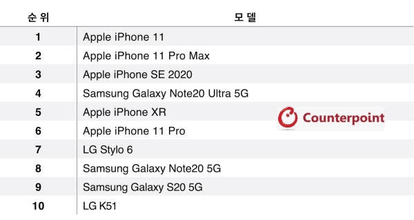 ขณะที่คู่แข่งอย่าง Samsung Galaxy Note 20 Ultra 5G สอดแทรกเข้ามาอยู่ในอันดับ 4 ตามมาด้วย Galaxy Note 20 5G และ Galaxy S20 5G อยู่ในอันดับที่ 8 และ 9 ตามลำดับ