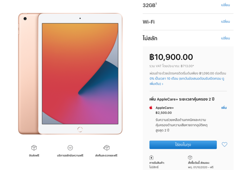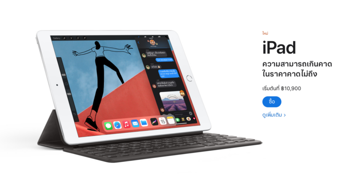 โดย iPad รุ่นที่ 8 ที่เริ่มให้สั่งซื้อล่วงหน้านี้มีราคาเริ่มต้นที่ 10,900 บาทและเร่ิมจัดส่งได้ตั้งแต่วันที่ 1 ต.ค. 2563 ไปต้นไป ทั้งนี้ระยะเวลาในการจัดส่งขึ้นอยู่กับพื้นที่ในการจัดส่ง