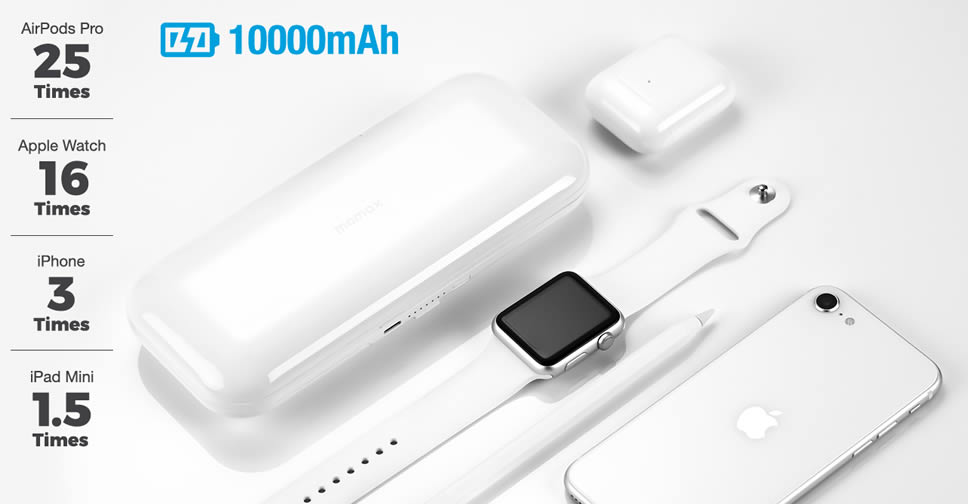 MOMAX Airbox มีความจุแบตเตอรี่ 10,000mAh รองรับชาร์จเร็ว 20W หรือชาร์จไร้สาย 10W ได้รับการรับรอง MFi และ Qi อีกทั้งยังออกแบบมาให้มีช่องเก็บ Apple Pencil 2 และ AirPods Pro ทำให้การพกพาสะดวกขึ้น ไม่ต้องพกพาสายชาร์จ และ Power Adapter สำหรับอุปกรณ์ทุกอย่างที่มี นอกจากนี้ยังสามารถพกพาขึ้นเครื่องบินได้ เพราะผ่านการอนุมัติจาก TSA (หน่วยงานรักษาความปลอดภัยด้านการขนส่งของสหรัฐอเมริกา)