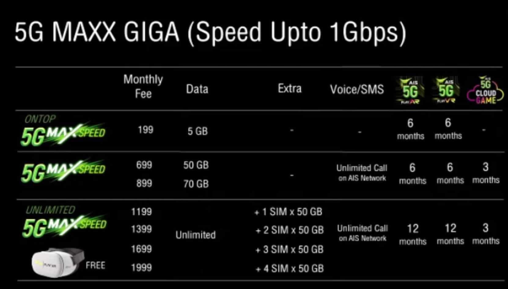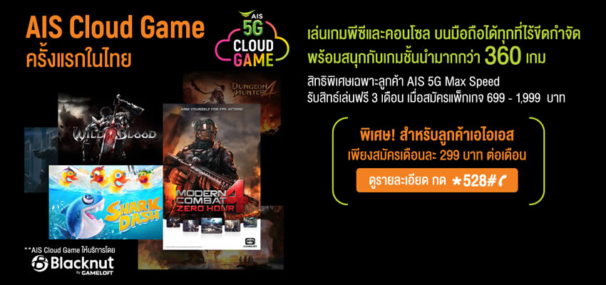 AIS เปิดตัวแพ็กเกจ 5G MAXX GIGA ความเร็วสูงสุด 1Gbps ราคาสุดคุ้มเริ่มต้นเดือนละ 199 ใช้งานดาต้า 5GB ฟรี!! บริการ AIS 5G PLAY AR นาน 6 เดือน และ AIS 5G PLAY VR นาน 6 เดือน หรือเลือกแพ็กเกจรายเดือน 699 และ 899 ได้รับดาต้า 50GB และ 70GB ตามลำดับ ฟรี!! บริการ AIS 5G PLAY AR นาน 6 เดือน, AIS 5G PLAY VR นาน 6 เดือน , AIS 5G CLOUD GAME นาน 3 เดือน และโทรฟรีผ่านในเครือข่าย AIS ได้ไม่จำกัด