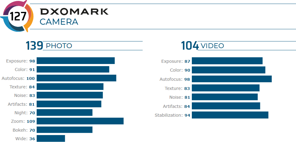สำหรับการถ่ายวิดีโอได้รับ 104 คะแนน โดยมีจุดเด่นที่สามารถควบคุมจุดรบกวนได้ดี, เปิดรับที่แม่นยำ, ระบบออโต้โฟกัสทำงานรวดเร็วและติดตามโฟกัสได้อย่างมีประสิทธิภาพ, ระบบป้องกั่นภาพสั่นไหวมีประสิทธิภาพ และให้รายละเอียดในระดับสูง