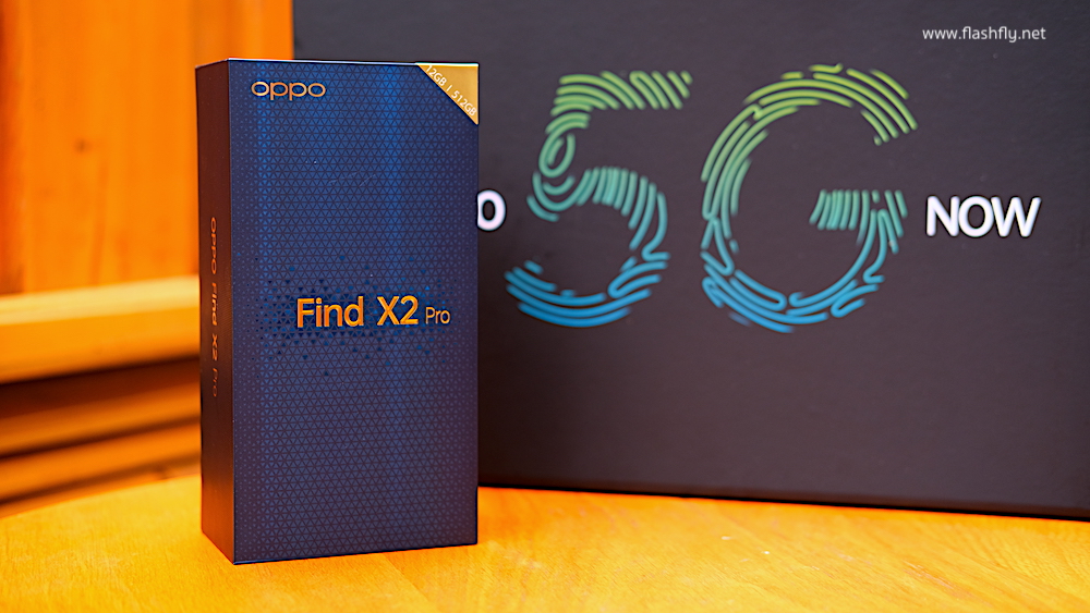 บนฝากล่องจะมีคำว่า OPPO 5G NOW ขนาดใหญ่ โดยเฉพาะเน้นที่คำว่า 5G ที่ขยายจนเต็มพื้นที่บนกล่อง พร้อมลวดลายสวยงาม