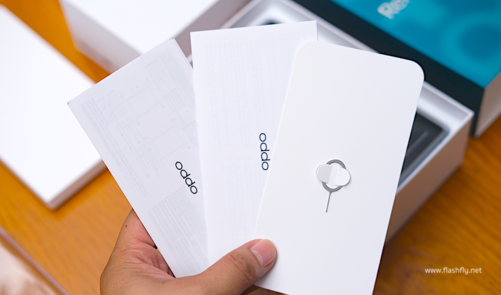 เมื่อเปิดกล่องออกมาก็จะพบกับซองเอกสาร สำหรับเก็บคู่มือแนะนำการใช้งานเบื้องต้น บัตรรับประกัน เคส และ เข็มจิ้มถาดใส่ซิมการ์ด