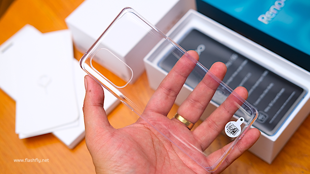 ถัดมาจะพบกับสมาร์ทโฟน OPPO Reno4 Z 5G ที่ถูกห่อหุ้มไว้ด้วยแผ่นพลาสติก และยังระบุจุดเด่นไว้ 5 รายการ ได้แก่ รองรับ 5G Dual-mode ทั้ง SA และ NSA, จอแสดงผลให้อัตราการรีเฟรช 120Hz, กล้องคู่หน้าแบบ In-Display, กล้องหลัง 4 ตัว 48MP Ultra-wide Quad Camera และ ความจำขนาดใหญ่ RAM 8GB + ROM 128GB