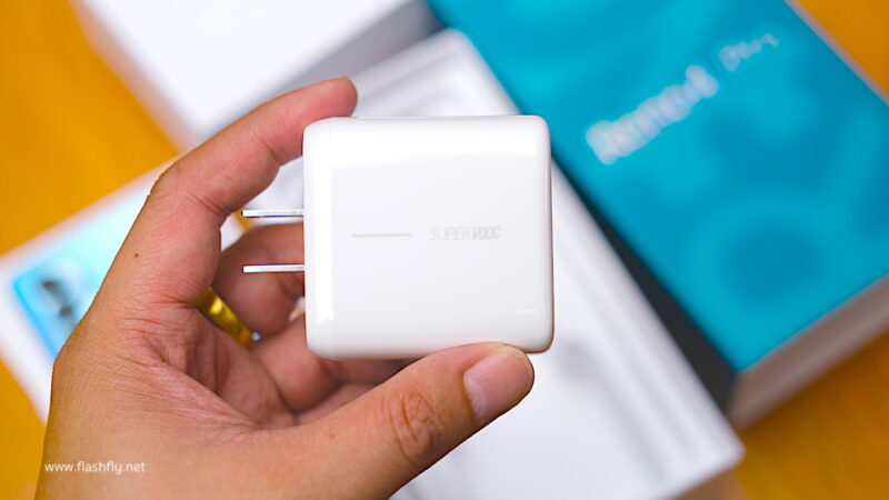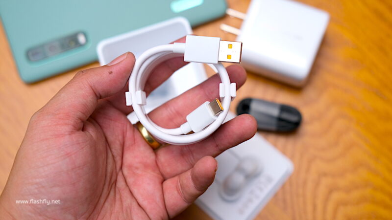 ชั้นล่างสุดเป็นที่เก็บหูฟังแบบ USB Type-C, สายเคเบิล USB Type-C และ อุปกรณ์ชาร์จแบตเตอรี่ 65W SuperVOOC 2.0