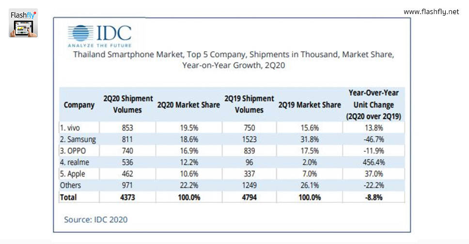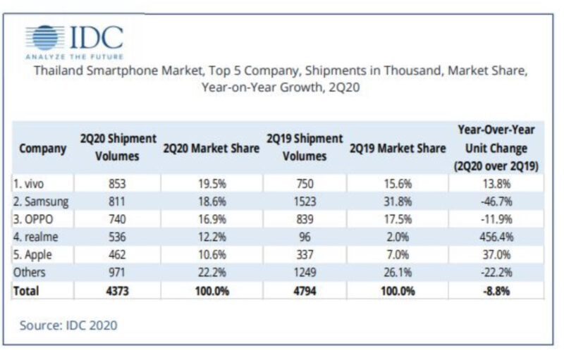 IDC ยังเปิดเผย 5 อันดับแบรนด์สมาร์ทโฟนขายดีที่สุดในประเทศไทย ช่วงไตรมาสที่ 2 ของปี 2020 โดย Vivo ขึ้นเป็นผู้นำในตลาด ด้วยยอดจัดส่ง 853,000 เครื่อง แซงหน้า Samsung ที่มียอดจัดส่ง 811,000 เครื่อง ตามมาด้วย OPPO (740,000 เครื่อง), realme (536,000 เครื่อง) และ Apple (462,000 เครื่อง)