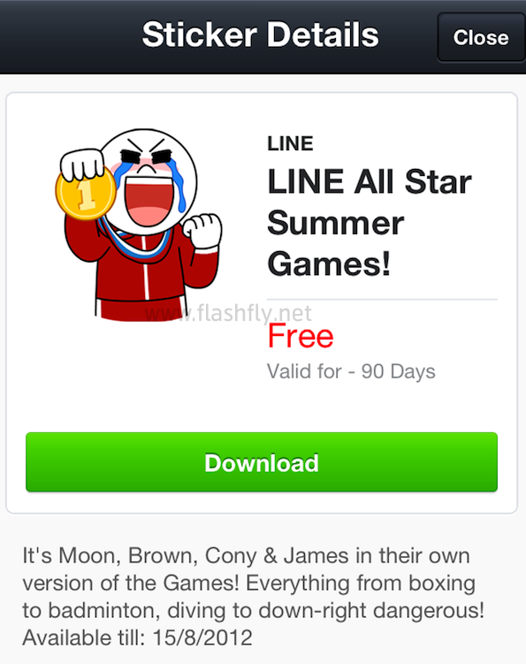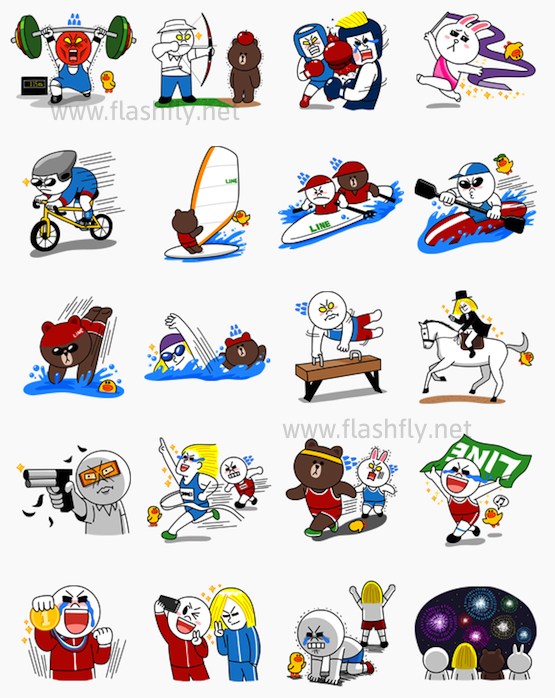 LINE ใจดีมีสติ๊กเกอร์มาให้ดาวน์โหลดใช้ฟรีกันอีกแล้ว คราวนี้มาในชุดของสติ๊กเกอร์ต้อนรับเทศกาลกีฬาโอลิปิกส์ ลอนดอน 2012 กับการจับเจ้าตัวการ์ตูนต่างๆ ไม่ว่าจะเป็น Moon , Brown , Cony และ James มาแปลงร่างเป็นนักกีฬาโอลิมปิกส์ประเภทต่างๆ เรียกได้ว่าเป็นสติ๊กเกอร์ที่อินเทรนด์กับเหตุการณ์ปัจจุบันได้ดีทีเดียว