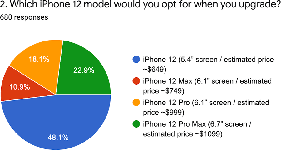 iPhone 12 Pro Max ที่คาดว่าจะมีขนาดหน้าจอใหญ่ถึง 6.7 นิ้ว ได้รับความสนใจ 22.9% จากผู้ตอบแบบสอบถาม ตามมาด้วย iPhone 12 Pro (18.1%) และ iPhone 12 หรือ 12 Max (10.9%)