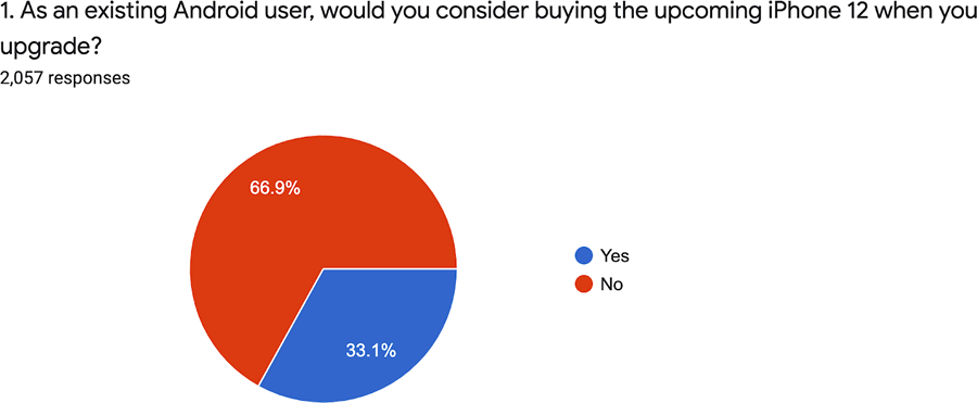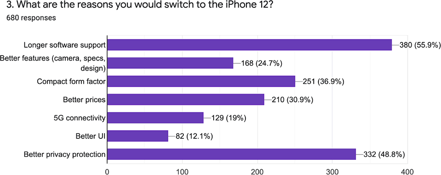 จำนวน 48.8% ของผู้ตอบแบบสอบถาม มองว่า iPhone 12 สามารถปกป้องข้อมูลส่วนได้ดีกว่า และ 36.9% ที่กำลังหนีจาก Android ให้เหตุผลว่าต้องการสมาร์ทโฟนที่มีขนาดกะทัดรัดมากขึ้น โดยเทใจให้ iPhone 12 mini ถึง 48.1%