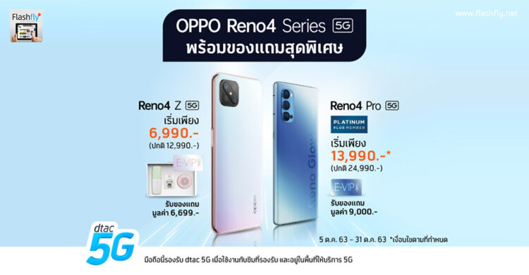 OPPO Reno4 Z 5G สุดยอดสมาร์ทโฟน 5G ในราคาระดับกลางที่คุ้มค่าที่สุด ราคาปกติ 12,990 บาท พร้อมรับของพรีเมียมจาก OPPO ได้แก่ OPPO Gift set และ E –VIP Card ประกันหน้าจอแตก 1 ปี รวมมูลค่า 6,699 บาท โดย