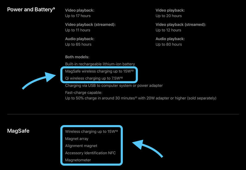 อย่างไรก็ตาม เว็บไซต์ทางการของ Apple ได้ระบุไว้อย่างชัดเจนว่า การชาร์จไร้สายสูงสุด 15W ของ iPhone 12 รองรับเฉพาะการชาร์จร่วมกับ MagSafe Charger หรือ MagSafe Duo Charger เท่านั้น ถ้าหากชาร์จผ่านอุปกรณ์ชาร์จทั่วไปของ Qi ยังรองรับสูงสุด 7.5W