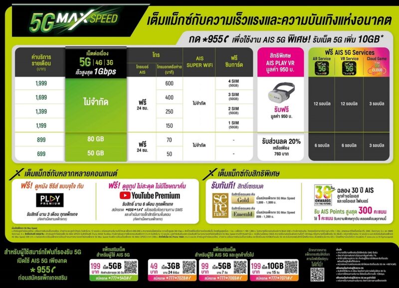 - แพ็กเกจรายเดือน 5G MAX SPEED ค่าบริการเริ่มต้น 699 บาท เล่นเน็ต 5G เต็มสปีด ความเร็วสูงสุด 1 Gbps จำนวน 50GB, โทรฟรีในเครือข่าย ตลอด 24 ชม., สิทธิ์ใช้งานผ่านแอปพลิเคชัน AIS 5G PLAY AR และ AIS 5G PLAY VR ฟรี นาน 6 เดือน เล่นเกมผ่าน AIS Cloud Game ฟรี นาน 3 เดือน