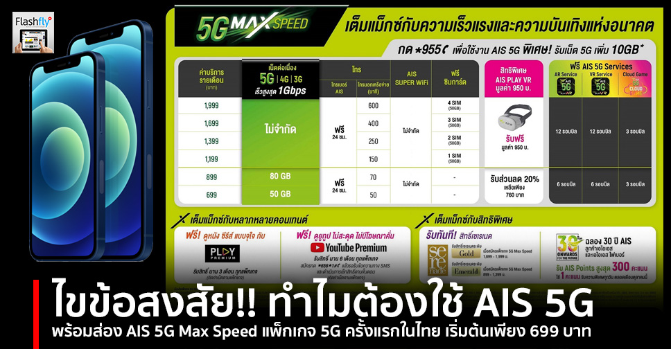 ถ้าจะพูดถึง 5G ในบ้านเรา เรียกได้ว่าเป็นอีกหนึ่งเรื่องราวที่ได้รับความสนใจเป็นอย่างมาก ซึ่งก่อนหน้านี้ทางผู้ให้บริการเครือข่ายยักษ์ใหญ่ทั้งสามค่ายต่างพากันออกมาแสดงความพร้อมในการเปิดใช้งาน 5G พร้อมนำเสนอจุดเด่นของการให้บริการ 5G ของตนออกมาให้เห็นกันอย่างมากมาย โดยล่าสุดกระแสของ 5G กลายเป็นกระแสฮอตอีกครั้งหลังจากที่ทาง AIS ได้ออกมาประกาศเปิดตัวแพ็กเกจ 5G ใหม่ล่าสุดในวันที่ 1 ต.ค. 63 ที่ผ่านมา เพราะเป็นแพ็กเกจที่มาพร้อมกับความคุ้มค่าและบริการใหม่ๆที่น่าสนใจมากมาย จนทำให้หลายคนสงสัยและสอบถามกันเข้ามาว่า 5G ของ AIS มีอะไรดี มีอะไรน่าสนใจบ้าง วันนี้ทางทีมงาน @flashfly จึงขอมัดรวมเรื่องราว 5G ของ AIS รวมถึงบริการที่เกี่ยวของกับ AIS 5G มาเล่าสู่กันฟังกันเลยดีกว่า