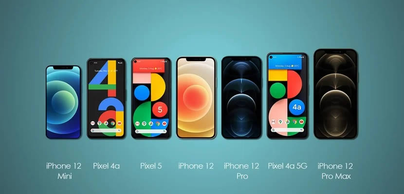 iPhone 12 mini มีขนาดใกล้เคียงที่สุดกับ Pixel 4a และ Pixel 5 ซึ่งสมาร์ทโฟนของ Google ทั้ง 2 รุ่น มีขนาดหน้าจอ 6.2 นิ้ว และ 6 นิ้ว ตามลำดับ และทั้งคู่ก็มีขนาดเล็กกว่า iPhone 12 กับ iPhone 12 Pro ที่มีขนาดหน้าจอ 6.1 นิ้ว