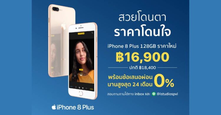 iStudio by SPVi นำเสนอ iPhone 8 Plus 128GB ราคาพิเศษเพียง 16,900 บาท จากราคาปกติ 18,400 บาท และยังสามารถผ่อนชำระ 0% ได้นานสูงสุดถึง 24 เดือน เฉลี่ยจ่ายเพียงเดือนละ 705 บาทเท่านั้น (เฉพาะบัตรเครดิตที่ร่วมรายการ) แต่ต้องรีบหน่อยเพราะสินค้ามีจำนวนจำกัด
