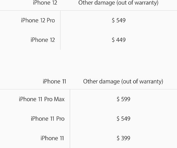 สำหรับเจ้าของ iPhone 12 ที่มี AppleCare+ จะจ่ายค่าซ่อมแซมจอแสดงผล ในราคาเพียง 29 ดอลล่าร์สหรัฐ หรือ 1,000 บาท สำหรับความเสียหายอื่นๆ คิดค่าซ่อม 99 ดอลล่าร์สหรัฐ หรือ 3,300 บาท