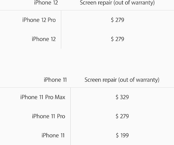 ค่าซ่อมแซมจอแสดงผล สำหรับ iPhone 12 ที่ไม่ได้อยู่ในการรับประกัน อยู่ที่ 279 ดอลล่าร์สหรัฐ หรือ 8,899 บาท เท่ากับรุ่น Pro ซึ่งคาดว่ามาจากการที่ iPhone 12 เปลี่ยนมาใช้จอแสดงผล OLED ขณะที่ iPhone 11 ใช้จอแสดงผล LCD