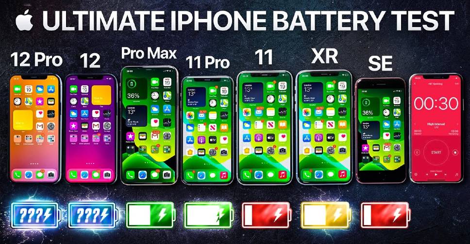 การทดสอบแบตเตอรี่ของ Mrwhosetheboss มีการตั้งค่า iPhone ทุกรุ่นให้อยู่ในสถานะเดียวกัน ทั้งความสว่าง สุขภาพแบตเตอรี่ ทั้งหมดยังทำงานบน iOS 14 และไม่ได้ใส่ซิมการ์ด โดยได้ผลการทดสอบออกมาตามรายการด้านล่าง