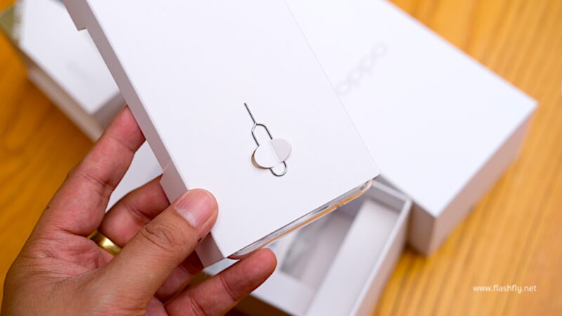 เมื่อถอดปลอกกล่องออกไป จะพบกล่องสีขาวที่เรียบง่ายสะอาดตา มีเพียงโลโก้ OPPO พิมพ์อยู่บนกล่อง และด้านข้าง