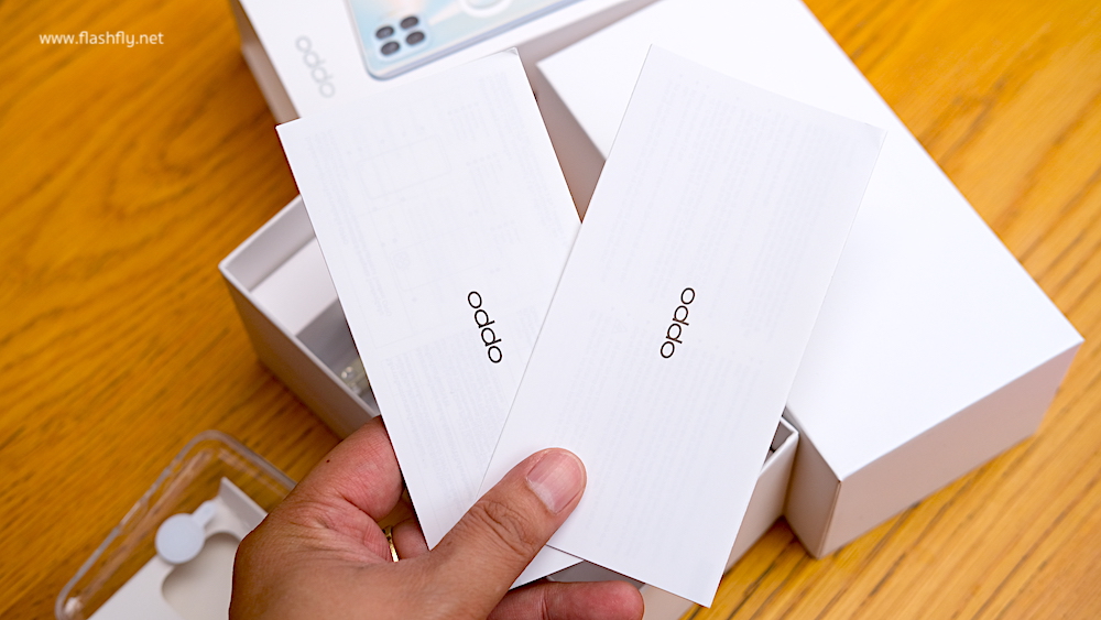 หลังจากยกฝากล่องออกไป จะพบกับสมาร์ทโฟน OPPO A93 ถูกห่อหุ้มด้วยแผ่นพลาสติก พร้อมระบุจุดเด่นไว้ที่ด้านหน้า 4 รายการเหมือนด้านหลังกล่อง