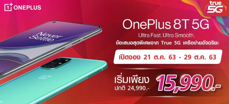 ทรูมูฟ เอช เครือข่ายยอดเยี่ยมแห่งปีในเอเชียแปซิฟิก แรงทุกทิศ ครอบคลุมทั่วไทย โดย ดร.ธีรเดช ดำรงค์พลาสิทธิ์ (คนที่สี่จากซ้าย) ผู้อำนวยการด้านบริหารผลิตภัณฑ์ดีไวซ์ บมจ. ทรู คอร์ปอเรชั่น ร่วมกับ วันพลัส โดย นายกฤษณะ ตระกูลล้ำฟ้า (คนที่สามจากซ้าย) ประธานกรรมการ บริษัท วันพลัส ประเทศไทย เปิดจอง OnePlus 8T 5G Ultra Fast. Ultra Smooth สมาร์ทโฟน 5G ขีดสุดของความเร็วแรง ลื่นไหลจาก OnePlus บน True 5G เครือข่ายอัจฉริยะที่ดีที่สุด ครบกว่า แรงกว่า ครอบคลุมกว่า ในราคาเริ่มต้นเพียง 15,990 บาท (ปกติ 24,990 บาท) ใช้ True5G ฟรี! ถึงสิ้นปี เล่นเน็ตเต็มสปีด พร้อมโทรในเครือข่ายฟรี 24 ชม. ดูฟรี! ทรูพรีเมียร์ลีกฤดูกาล 2020/2021 ผ่านแอปทรูไอดี เมื่อสมัครแพ็กเกจ 1299 ขึ้นไป และรับเน็ตฟรีสำหรับดูหนัง ดูซีรีส์ บน Netflix ไม่อั้น นาน 12 เดือน เมื่อสมัครแพ็กเกจ 699 ขึ้นไป (ไม่รวมค่าสมาชิกรายเดือน Netflix) และรับทรูพอยท์ 1 คะแนน เมื่อซื้อสินค้า ครบทุก 100 บาท แลกรับสิทธิพิเศษต่างๆ ได้มากมาย พร้อมผ่อน 0% นานสูงสุด 36 เดือนหรือรับเครดิตเงินคืน 3% เมื่อชำระผ่านบัตรเครดิตที่ร่วมรายการ พิเศษ ฟรีประกันหน้าจอแตก 1 ครั้ง นาน 1 ปี กระเป๋าเดินทาง OnePlus Travel Luggage และกระบอกขวดน้ำสุดพรีเมียม OnePlus Bottle มูลค่ารวม 15,170 บาท เปิดจองสมาร์ทโฟน OnePlus 8T 5G ตั้งแต่ 21 ตุลาคม 2563 – 29 ตุลาคม 2563 ที่ทรูช็อปทุกสาขาทั่วประเทศ, เว็บ True Store และ LINE@ True Store