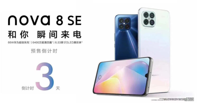 Huawei ปล่อยรูปภาพโปสเตอร์ออกมาโปรโมทสมาร์ทโฟน Nova 8 SE เผยให้เห็นดีไซน์อย่างชัดเจน พร้อมยืนยันว่ามาพร้อมจอแสดงผล OLED ขนาด 6.53 นิ้ว กล้องหลัก 64 ล้านพิกเซล และรองรับชาร์จเร็ว 66W