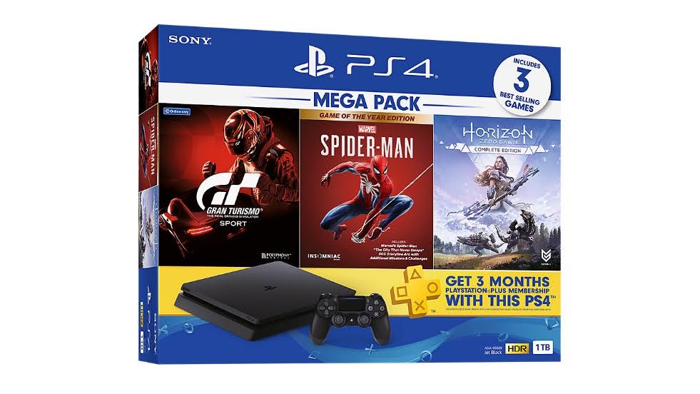 • ชุดเครื่องเกม PS4 MEGA PACK ประกอบด้วย เครื่องเกมคอนโซล PS4™ (CUH-2218BB01, สี Jet Black, ความจุ 1TB) และเกมฮิตจากทาง SIE Worldwide Studios ในรูปแบบแผ่นดิสก์ จำนวนถึง 3 เกม ได้แก่ Marvel’s Spider-Man Game of the Year Edition, Horizon Zero Dawn™ Complete Edition และ Gran Turismo Sport
