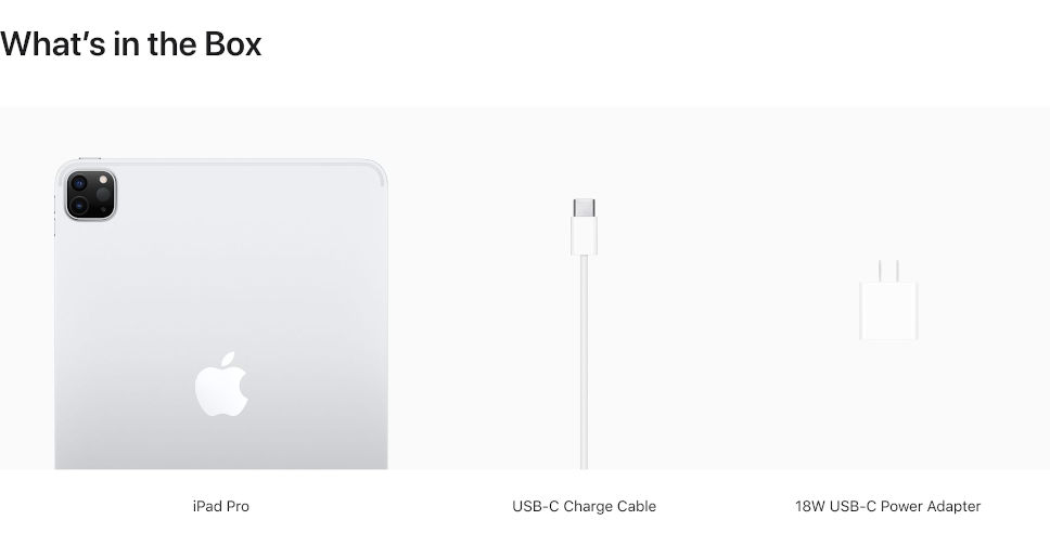 ผู้ที่เพิ่งสั่งซื้อ iPad Pro ยืนยันว่า ภายในกล่องได้รับ อะแดปเตอร์แปลงไฟ USB-C ขนาด 20 วัตต์ ขณะที่เว็บไซต์ทางการของ Apple ยังคงระบุว่าสิ่งที่มีมาให้ในกล่องยังเป็น อะแดปเตอร์แปลงไฟ USB-C ขนาด 18 วัตต์