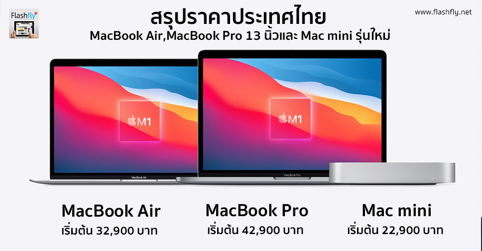 Apple ประกาศราคา MacBook Air รุ่น 13 นิ้ว, MacBook Pro รุ่น 13 นิ้ว, Mac mini รุ่นใหม่!! ที่มาพร้อมชิพ M1 ในประเทศไทยออกมาแล้ว MacBook Air เริ่มต้น 32,900 บาท MacBook Pro เริ่มต้น 42,900 บาท และ Mac mini เริ่มต้น 22,900 บาท