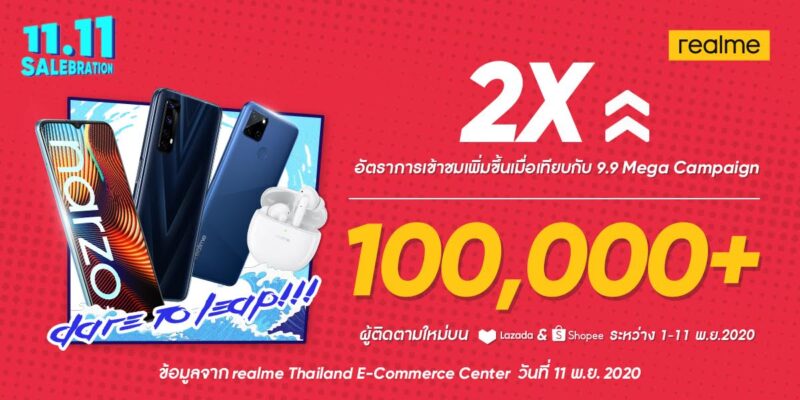 realme แบรนด์สมาร์ทโฟนเพื่อคนรุ่นใหม่ที่เติบโตเร็วที่สุดในโลก โดยมียอดจัดส่งสมาร์ทโฟนมากกว่า 50 ล้านเครื่องทั่วโลก ขึ้นสู่ตำแหน่งแบรนด์อันดับ 7 ของโลก ภายในระยะเวลาเพียง 2 ปี เพื่อเป็นการตอบแทนกระแสตอบรับจากผู้ใช้งาน realme ได้จัดแคมเปญ 11.11 SALEBRATION จัดโปรโมชั่นพิเศษสำหรับสมาร์ทโฟนและผลิตภัณฑ์ AIoT วางจำหน่ายผ่านช่องทางออนไลน์อย่าง Lazada และ Shopee เมื่อวันที่ 11 พฤศจิกายนที่ผ่านมา ซึ่งจากแคมเปญดังกล่าว realme ประสบความสำเร็จโดยมีการเติบโตจากยอดขายสมาร์ทโฟนที่สูงขึ้นกว่า 123% และยอดจำหน่ายสมาร์ทโฟนต่อเครื่องมากกว่า 200%
