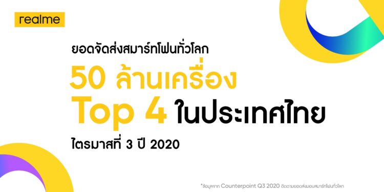 realme ครองอันดับ 4 ในประเทศไทย ในไตรมาสที่ 3 ปี 2020 พร้อมยอดจัดส่งสมาร์ทโฟนทั่วโลกกว่า 50 ล้านเครื่อง เป็นแบรนด์สมาร์ทโฟนที่เติบโตเร็วที่สุดในโลก