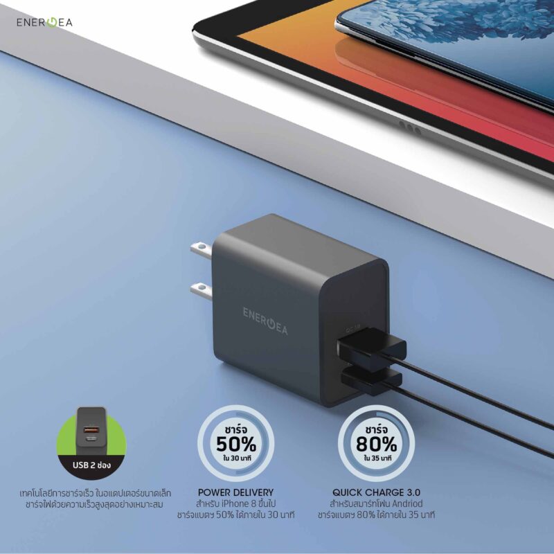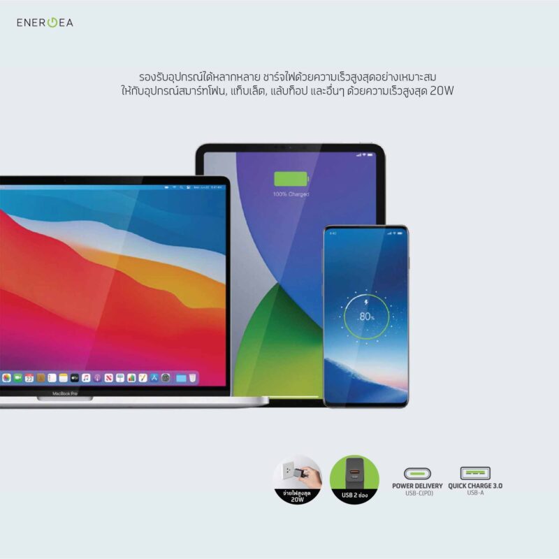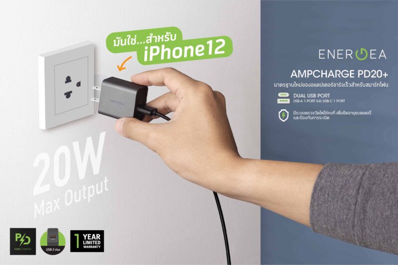 นอกจากนี้แบรนด์ Energea ยังเอาใจสาวก iPhone 12 กับหัวปลั๊กชนิด 2 หัว Energea รุ่น AMPCHARGE PD20+ มาพร้อมระบบ Power Delivery (PD20W) โดยมี 2 ช่องแบบ 2 in 1 คือ USB-A และ USB-C และชาร์จไฟได้ พร้อมกันถึง 2 หัวเลยทีเดียว โดยช่องต่อ USB-A ที่รองรับระบบ Quick Charge 3.0 โดยจ่ายไฟได้สูงสุด 20W และ ช่องต่อ USB-C ที่รองรับระบบ Power Delivery 20W โดยจ่ายไฟได้สูงสุด 20W สามารถชาร์จแบตเตอรี่ของคุณให้เต็ม จาก 50% ให้เต็มภายในเวลา 30 นาที หากชาร์จไฟ 2 ช่องพร้อมกันให้กำลังไฟ 15W โดย Energea รุ่น AMPCHARGE PD20+ มีระบบปกป้องอุปกรณ์ ของคุณด้วยการจ่ายกำลังไฟตามกำลังสูงสุดเท่าที่โทรศัพท์จะรับได้ เพื่อให้แบตเตอรี่ไม่เสื่อมเพราะมีระบบตรวจตัดไฟ รองรับการเชื่อมต่อของสาย USB-A, USB-C ทั้งรุ่นใหม่และรุ่นเก่าของคุณได้อย่างสบายๆ กับการชาร์จกับ iPhone, iPad, Smart Phone และอุปกรณ์อื่นๆได้เป็นอย่างดี โดย Energea รุ่น AMPCHARGE PD20+ มีราคาพิเศษช่วงเปิดตัว iPhone 12 เหลือเพียง 790 (ปกติ 890 บาท)