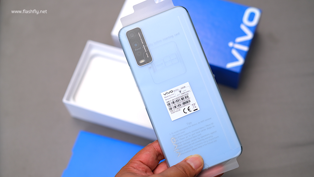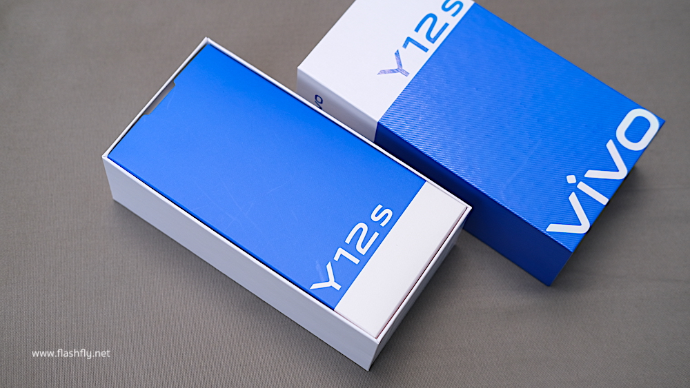 Vivo Y12s ถูกเก็บไว้ในกล่องสีทูโทน (สีขาว/สีน้ำเงิน) ไม่มีการพิมพ์รูปภาพสมาร์ทโฟนไว้บนกล่อง มีแต่ชื่อรุ่น Y12s ขนาดใหญ่ชัดเจน และโลโก้ Vivo ที่ด้านล่าง มุมบนกล่องระบุความจำ RAM 3GB + ROM 32GB