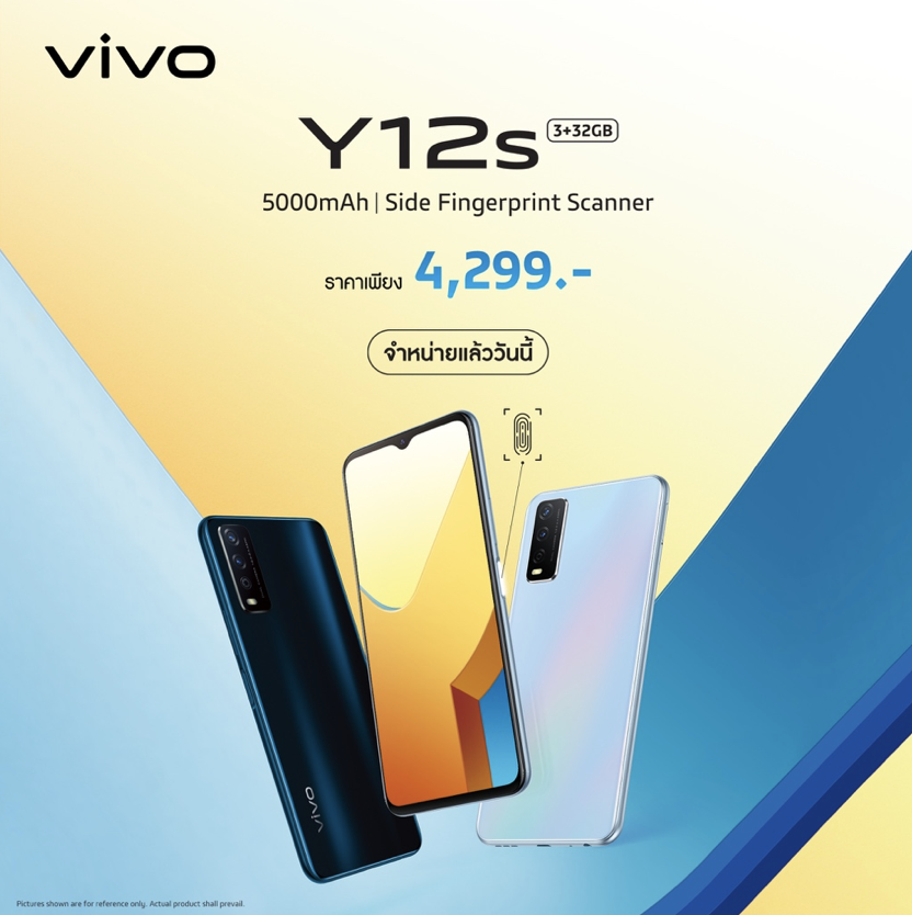 Vivo Y12s วางจำหน่ายวันแรกในราคา 4,299 บาท โดยมีให้เลือกถึง 2 สีด้วยกัน ได้แก่ Phantom Black ( สีดำ) , Glacier Blue (สีน้ำเงิน)