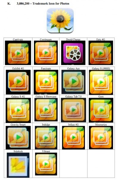 นอกจากที่ Samsung จะถูกกล่าวหาในคดีความในส่วนของการก๊อปปี้ hardware ของ Apple แล้วยังมีหลักฐานที่แสดงให้เห็นว่า Samsung ยังได้ก๊อปปี้การออกแบบไอคอนของ Apple มาใช้ในส่วนของ TouchWiz UI ของตนอีกด้วย ซึ่งภาพที่ถูกแสดงออกมานั้นทำให้เห็นว่ามีไอคอนที่ถูกออกแบบโดย Samsung ในบางภาพที่ต้องยอมรับว่าเป็นการก๊อปปี้การออกแบบไอคอนของ Apple โดยตรง ตัวอย่างเช่น ไอคอนการโทรออกที่ใช้รูปหูฟังโทรศัพท์อยู่บนพื้นสีเขียวเหมือนกัน , ไอคอนส่วนของแกลลอรี่ที่มีการใช้ภาพของดอกทานตะวันเหมือนกัน และไอคอนส่วนของ Contract ที่ดูเหมือนว่าจะมีการออกแบบที่ให้ look and feel ที่เหมือนกันทั้งการใช้สัญญลักษณ์และการจัดวางตำแหน่งที่เหมือนกัน ในขณะที่บางภาพน่าจะเป็นลักษณะของการได้รับแรงบันดาลใจจาก Apple เท่านั้นเช่นไอคอนของ setting ที่มีการใช้รูปเกียร์ซึ่งน่าจะเป็นสัญญลักษณ์พื้นฐานที่ใช้กันทั่วไป เป็นต้น