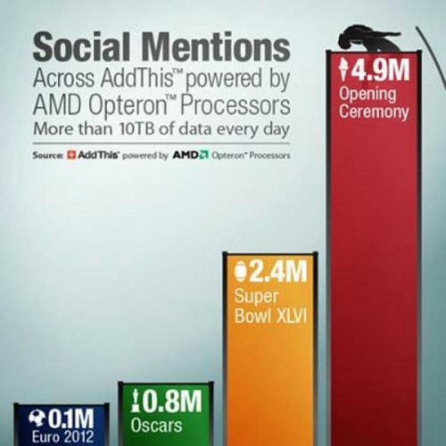 พิธีเปิดโอลิมปิกเกมที่ลอนดอนสร้างปรากฏการณ์การใช้โซเชียลมีเดียที่เกี่ยวกับกิฬาและบันเทิงที่มีผู้คนแชร์มากที่สุดในโลกถึง 4.95 ล้านครั้ง ลบสถิติเดิมจากการแข่งขันซูเปอร์โบวล์ XL VI ถึง 106 เปอร์เซ็นต์ ข้อมูลนี้นำเสนอโดย AddThis ซึ่งเป็นแพลตฟอร์มโซเชียลแชร์ริ่งที่ใหญ่ที่สุดในโลก ที่มีเว็บโดเมนถึง 14 ล้าน เข้ามาใช้และสามารถเข้าถึงผู้ใช้กว่า 1.3 พันล้านคนต่อเดือนทั่วโลก AddThis เป็นผู้ให้บริการแพลตฟอร์มแชรริ่งที่มีผู้นิยมใช้มาก เพราะผู้ใช้สามารถโพสท์ข้อความ หรือลิ้งค์กลับไปยังบรรดาเว็บโซเชียลมีเดียที่กำลังเป็นที่นิยมได้ AddThis ใช้ เซิร์ฟเวอร์ 1,000 เซิร์ฟเวอร์ ซึ่งใช้ตัวประมวลผลอันทรงพลัง AMD Opteron™ (NYSE: AMD) ของเอเอ็มดีที่มีประสิทธิภาพในการบริหารจัดการข้อมูลและดาต้าที่หนาแน่น