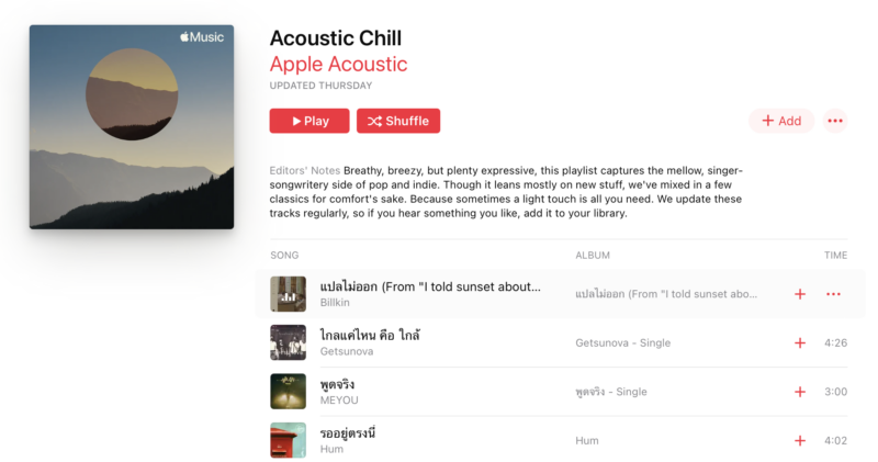 ฟังเพลย์ลิสต์ “Acoustic Chill” ได้ที่: https://music.apple.com/th/playlist/acoustic-chill/pl.b5e8dbe8a706496496e1292466839207