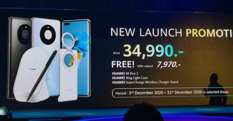 HUAWEI เปิดตัวสมาร์ทโฟนเรือธง Mate 40 Pro 5G อย่างทางการในประเทศไทย สามารถจับจองได้แล้วตั้งแต่วันนี้ ไปจนถึงวันที่ 31 ธันวาคม 2563 ราคา 34,990 บาท พร้อมรับฟรี!! ของแถมมูลค่า 7,970 บาท ประกอบด้วยสไตลัส HUAWEI M-Pen 2, HUAWEI Ring Light Case และ HUAWEI SuperCharge Wireless Charger Stand