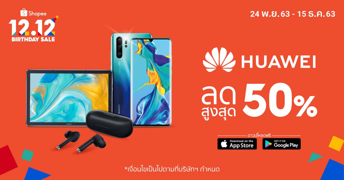 หัวเว่ย (HUAWEI) แบรนด์สมาร์ทโฟนชั้นนำระดับโลก ร่วมกับ ช้อปปี้ (Shopee) ผู้นำแพลตฟอร์มอีคอมเมิร์ซในเอเชียตะวันออกเฉียงใต้และไต้หวัน ร่วมสร้างสีสันเติมเต็มบรรยากาศแห่งการเฉลิมฉลอง ปลุกมู้ดคนไทยให้ช้อปสนุกด้วยดีลเด็ดส่งท้ายปี กับโอกาสดีๆ ในการเป็นเจ้าของสมาร์ทดีไวซ์ระดับโลกที่มาพร้อมดีไซน์ นวัตกรรม และฟีเจอร์สุดล้ำ กับส่วนลดสะท้านวงการสูงสุดกว่า 50% และโค้ดส่วนลดเพิ่ม 100 บาท พิเศษเฉพาะแคมเปญ Shopee 12.12 Birthday Sale เพื่อร่วมฉลองเดือนเกิดของ ช้อปปี้ ตั้งแต่วันนี้ – วันที่ 15 ธันวาคม 2563 เท่านั้น!