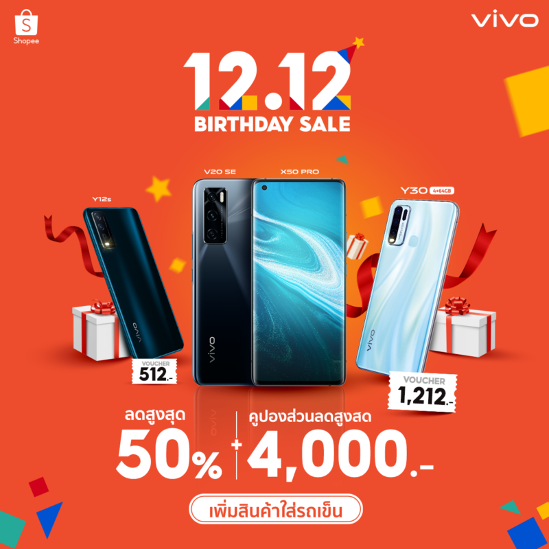 สาวก Vivo ที่กำลังมองหาโทรศัพท์ดี ๆ รับสิ้นปีสักเครื่อง อย่าพลาดกับแคมเปญ 12.12 นี้ ช้อปคุ้มแน่นอน ทั้ง voucher และ gift card แถมถ้าช้อปเร็ว ช้อปไวก้มีสิทธิ์รับ โทรศัพท์ Vivo Y12 ไปเลยฟรีๆ