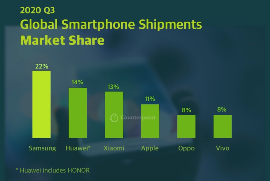 ข้อมูลจาก Counterpoint พบว่า Samsung เป็นผู้ผลิตสมาร์ทโฟนรายใหญ่ที่สุดของโลก ได้รับส่วนแบ่ง 22% จากยอดจัดส่ง 80.4 ล้านเครื่อง ตามมาด้วย Huawei ซึ่งรวมถึงแบรนด์ Honor ครองส่วนแบ่ง 14% ถัดมาเป็น Xiaomi มีส่วนแบ่ง 13% เติบโตขึ้น 75% เมื่อเทียบกับไตรมาสก่อน