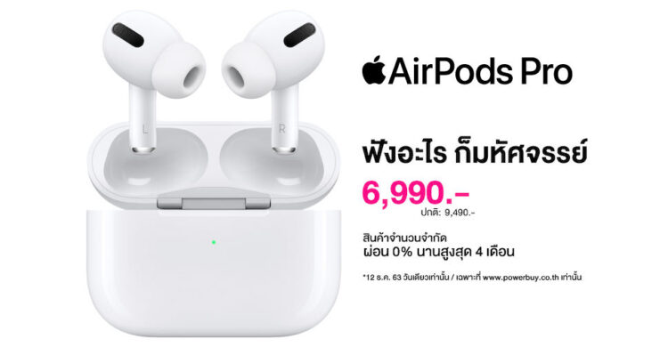 Power Buy มอบข้อเสนอพิเศษในแคมเปญ 12.12 หั่นราคา AirPods Pro เหลือเพียง 6,990 บาท เฉพาะวันที่ 12 ธันวาคม 2563 เท่านั้น!! และยังให้ผ่อน 0% นานสูงสุด 4 เดือน กับบัตรเครดิตที่ร่วมรายการ (สินค้าจำนวนจำกัด) สำหรับการสั่งซื้อทางช่องทางออนไลน์บนเว็บไซต์ powerbuy.co.th