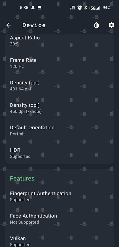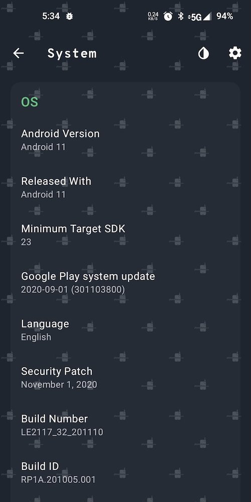 ข้อมูลในระบบยืนยันว่า OnePlus 9 5G จะมาพร้อมจอแสดงผล 2400 x 1080 พิกเซล ขนาด 6.55 นิ้ว ให้อัตราการรีเฟรชหน้าจอ 120Hz อัตราส่วนภาพ 20:9 สนับสนุนการแสดงผล HDR ใช้ชิปประมวลผล Qualcomm Snapdragon 888 ความจำ RAM 8GB จับคู่กับ ROM 128GB ความจุแบตเตอรี่ 4,500mAh และทำงานบนพื้นฐาน Android 11