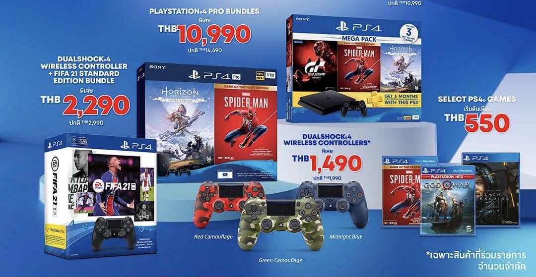 | PS4™ MEGA PACK (Marvel’s Spider-Man Game of the Year Edition, Horizon Zero Dawn™ Complete Edition, and Gran Turismo Sport) | THB 10,990 | THB 3,000 | THB 7,990 |