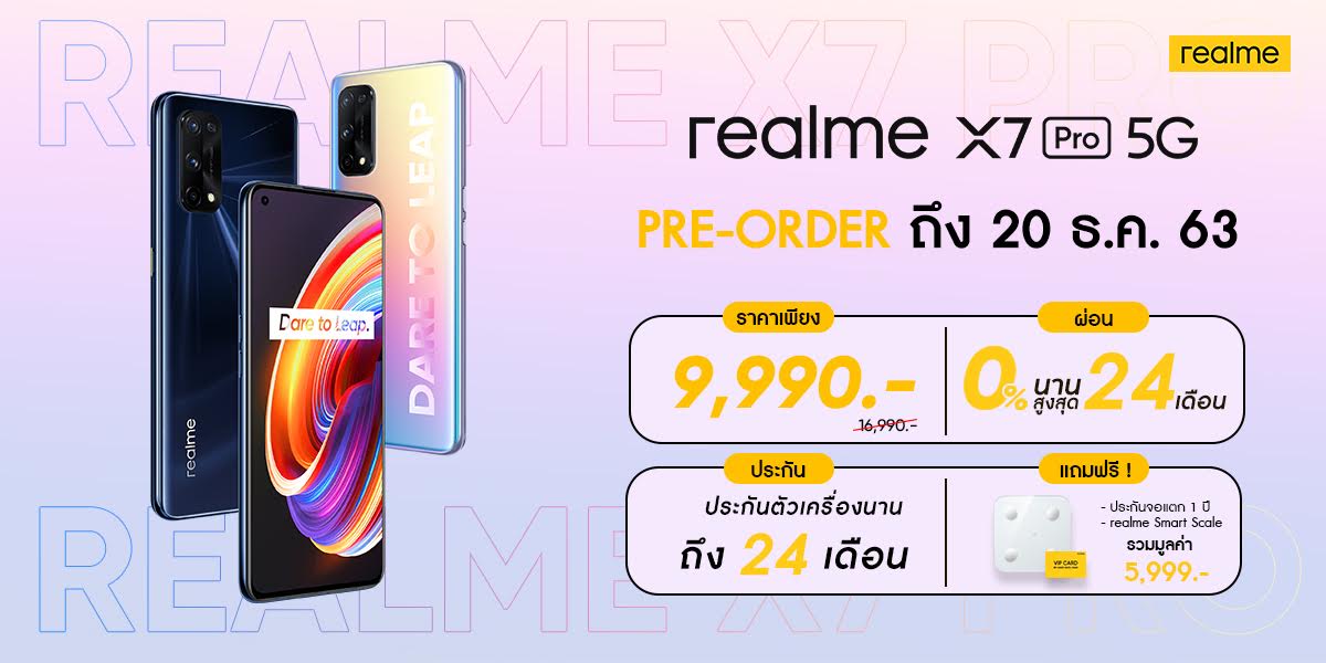 พิเศษ! สำหรับลูกค้าที่ Pre-order สามารถเป็นเจ้าของ realme X7 Pro 5G ในราคาพิเศษ เริ่มต้นเพียง 9,990 บาท จากปกติ 16,990 บาท พร้อมโปรโมชั่นผ่อน 0% นานสูงสุด 24 เดือนและรับทันที ประกันตัวเครื่องนาน 24 เดือน, VIP Card ประกันจอแตก 1 ปี และ realme Smart Scale เครื่องชั่งน้ำหนักอัจฉริยะ รวมมูลค่าทั้งหมด 5,999 บาท