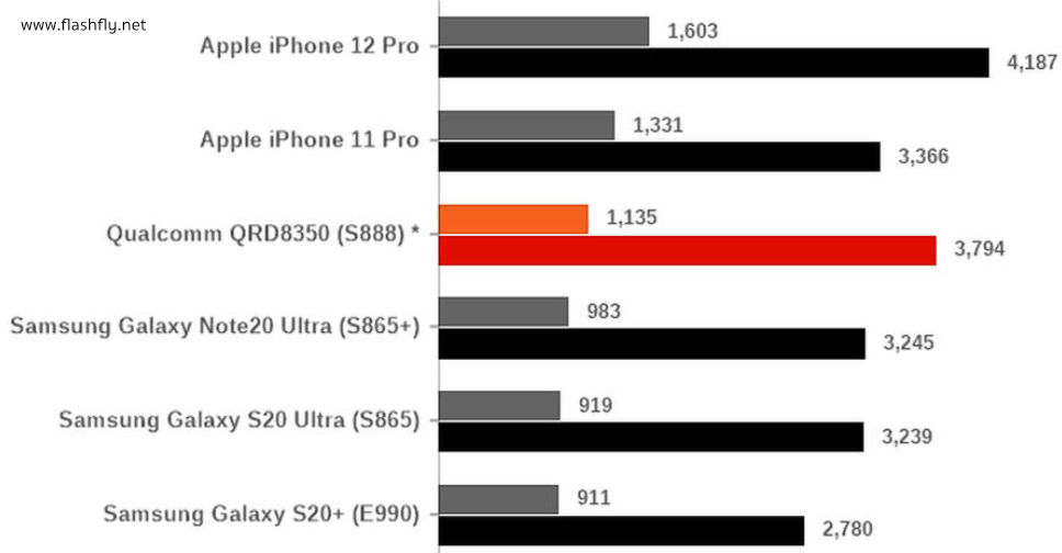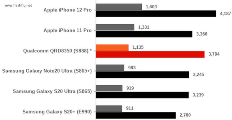 ผลจากการเปรียบเทียบประสิทธิภาพด้วยแอพ Geekbench 5 แสดงให้เห็นว่าชิป Snapdragon 888 ได้รับ 1,135 คะแนน สำหรับ single-core และทำได้ 3,794 คะแนน สำหรับ multi-core ขณะที่ชิป A14 ซึ่งอยู่ใน iPhone 12 Pro ได้รับ 1,603 คะแนน สำหรับ single-core และทำได้ 4,187 คะแนน สำหรับ multi-core
