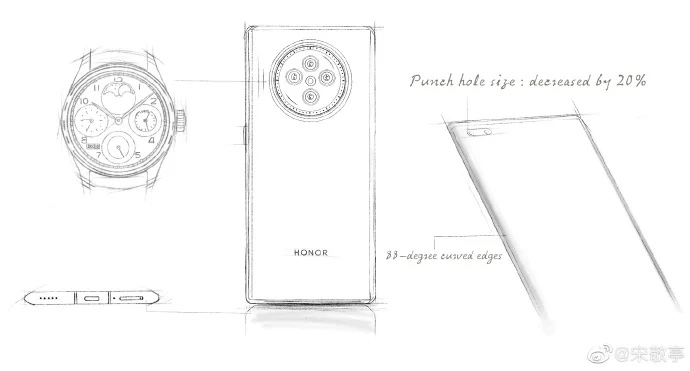 สมาร์ทโฟน Honor V40 ถูกปล่อยภาพเรนเดอร์ออกมาแล้ว พร้อมภาพร่างที่แสดงให้เห็นแนวคิดการออกแบบ จะเห็นว่าดีไซน์กล้องหลังได้รับแรงบันดาลใจมาจากนาฬิกาข้อมือ ขอบหน้าจอโค้ง 88 องศา และเจาะหลุมไว้ที่มุมบนหน้าจอ เพื่อวางกล้องคู่เซลฟี่