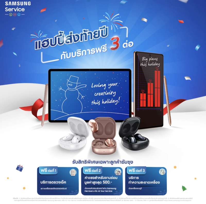 ซัมซุงขอมอบโปรโมชั่นสุดพิเศษส่งท้ายปี 2020 ให้ลูกค้าเข้ามารับบริการฟรี! สำหรับการตรวจเช็ค ทำความสะอาด รวมถึงฟรีค่าแรงเมื่อมีการซ่อมแซมสมาร์ทโฟน แท็บเล็ต และอุปกรณ์สวมใส่ ทุกรุ่น ตั้งแต่วันนี้ (25 ธันวาคม 2020) – 31 ธันวาคม 2020 จำนวนจำกัด โดยลูกค้าที่สนใจสามารถจองวันเข้ารับบริการได้ที่แอปพลิเคชัน Samsung Members และช่องทาง At Your Service หรือติดตามรายละเอียดเพิ่มเติมได้ที่ https://www.samsung.com/th/support/newsalert/120941/